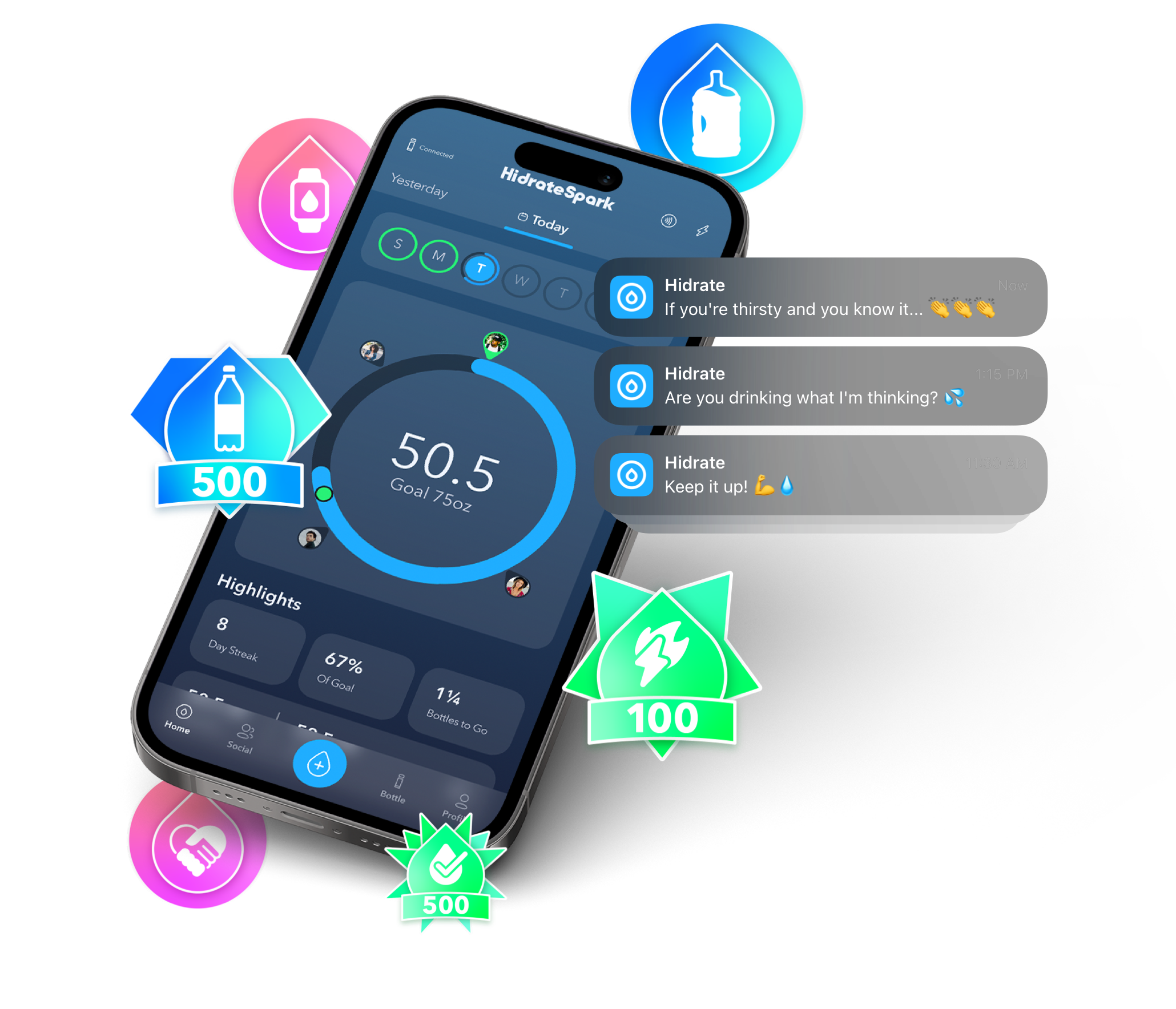 HidrateSpark is built on behavior change psychology, using subtle nudges, gamification, and challenges to help you drink more, consistently.